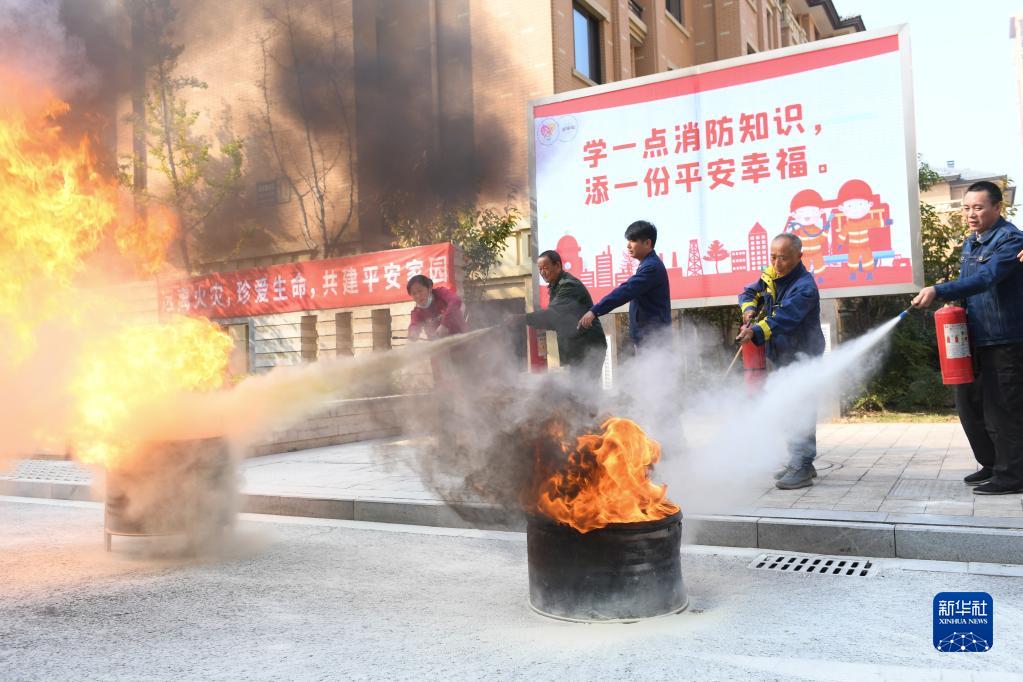11月8日,在湖州市吳興區環渚街道一個居民區,消防和應急部門工作人員指導居民熟悉滅火器的操作方式。