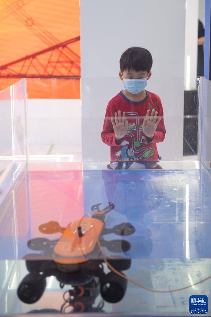 11月8日,小朋友在國家電網展臺參觀水下機器人。