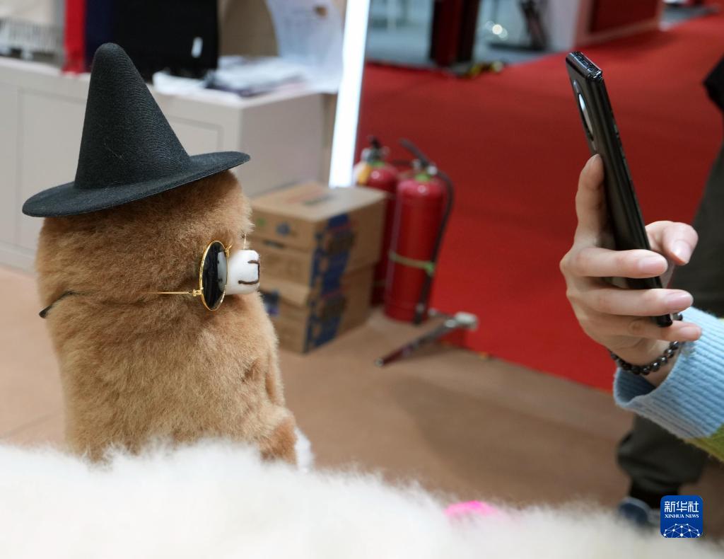 11月8日,在第五屆進博會上,參觀者拍攝“溫暖駝”展臺的羊駝玩偶。