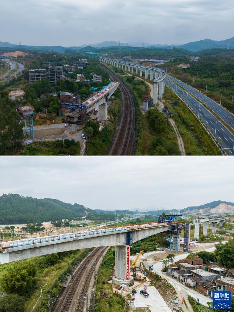 拼版照片:清遠磁浮旅游專線長隆特大橋跨京廣鐵路連續梁轉體前后的對比(上圖攝于11月7日,下圖攝于11月8日,無人機照片)。