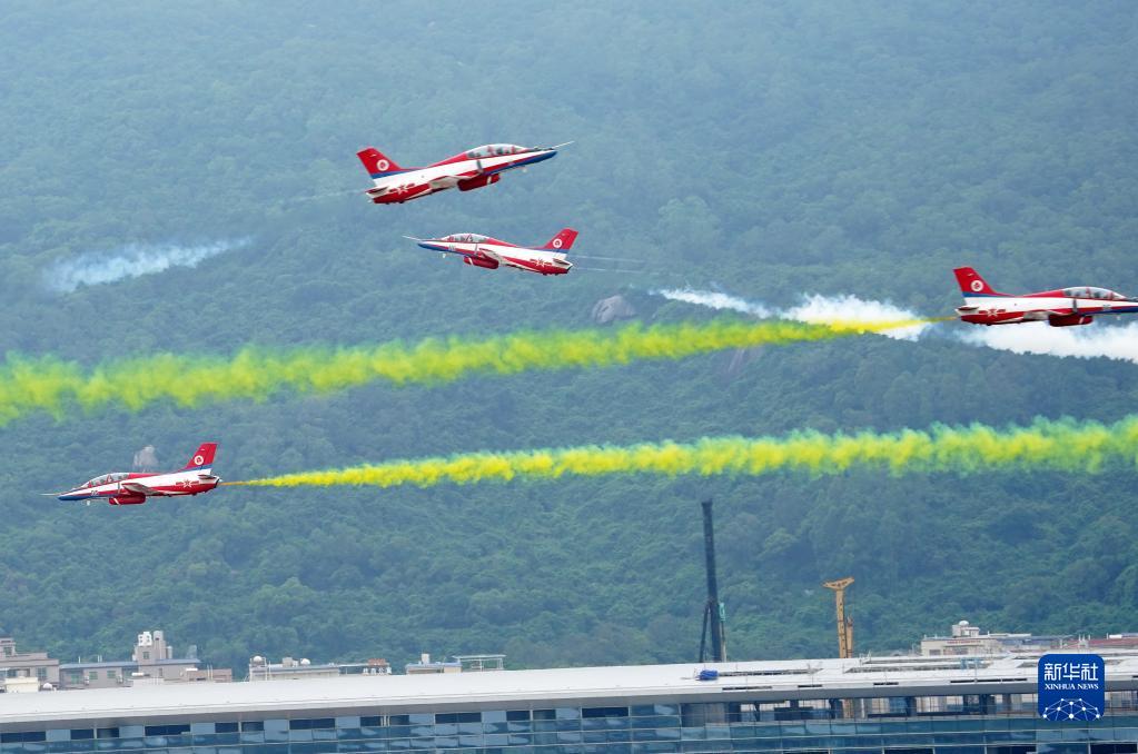 上午10時,首先進行飛行表演的是空軍八一飛行表演隊,6架殲-10呈現了大仰角躍升、六機編隊斤斗、六機同步橫滾等動作,不僅精彩震撼,同時也具備很高的實戰價值。作為空軍“學院派”飛行表演隊的空軍航空大學“紅鷹”飛行表演隊,以“飛出驚險、飛出極限、飛出震撼”而著稱。針對珠海的天氣與地域特點,他們今年增加了八機通場、八機盤旋等動作,表演更緊湊、更有看點。