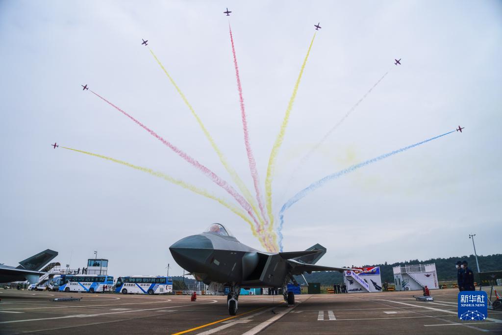 11月8日,空軍航空大學“紅鷹”飛行表演隊在第十四屆中國航展上進行飛行表演。新華社發(欒鋮 攝)