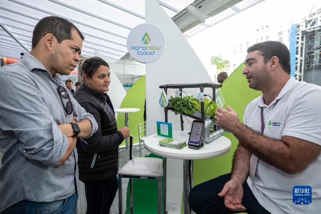 11月8日,在巴西里約熱內盧,工作人員在“里約創新周”上為參觀者講解一款植物生長監測系統。