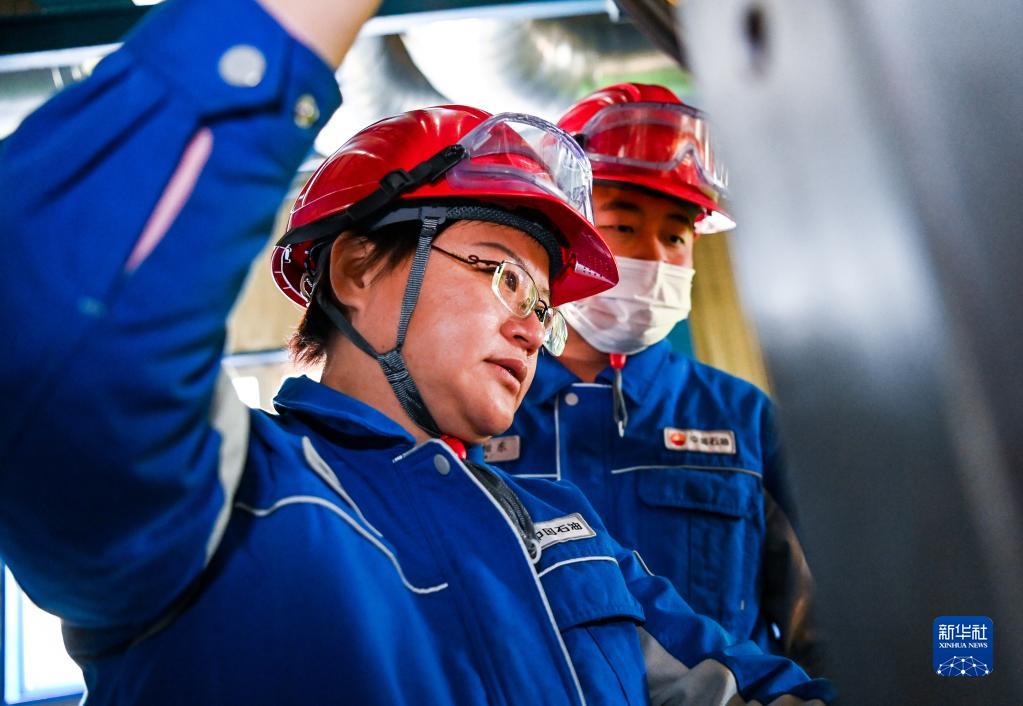 11月4日,在中國石油吉林石化公司煉油廠,李艷(左)為同事示范裝置操縱。