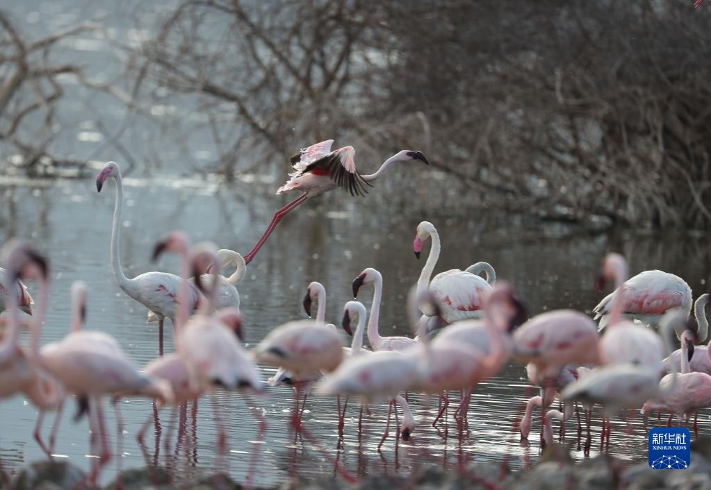 這是11月6日在肯尼亞博戈里亞湖拍攝的火烈鳥。