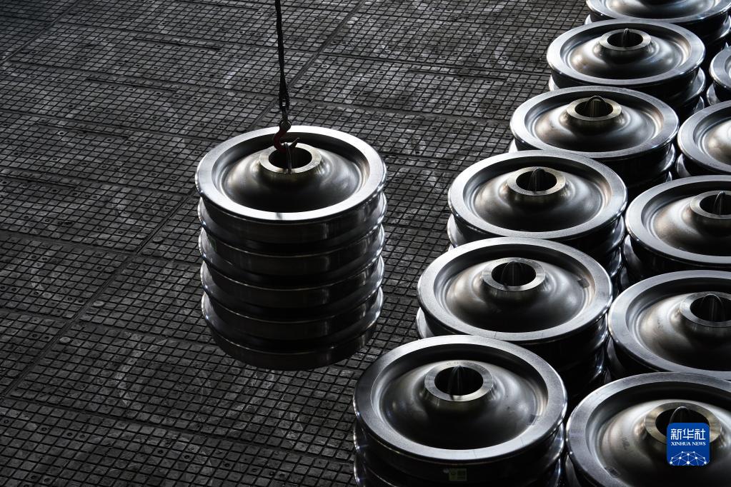 這是11月8日在位于安徽省馬鞍山市的中國寶武馬鋼軌交材料科技有限公司數字車輪智慧工廠內拍攝的成品車輪。