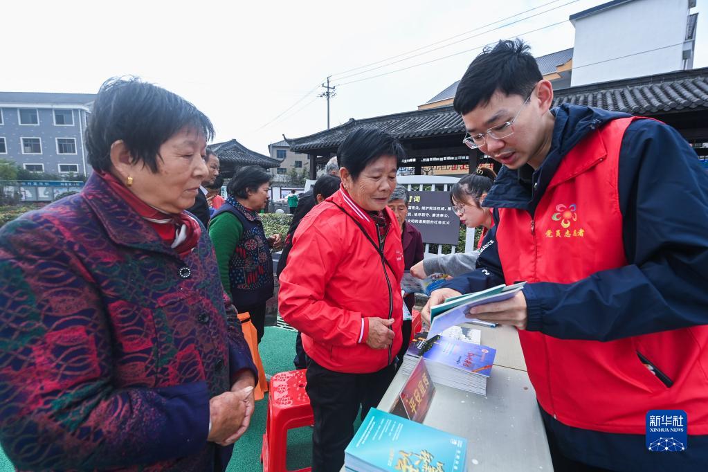 11月9日,在杭州市臨安區太陽鎮上太陽村,黨員志愿者向群眾發放法律相關宣傳資料。