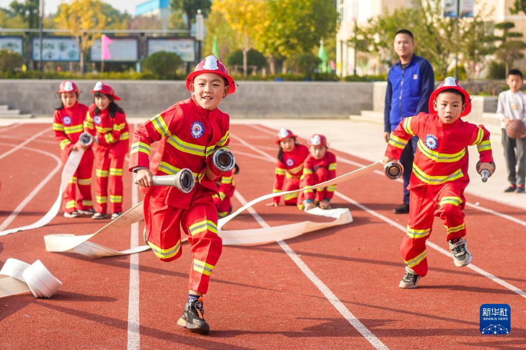 11月9日,在浙江省長興縣煤山鎮中心小學,學生在體驗消防員體能訓練。