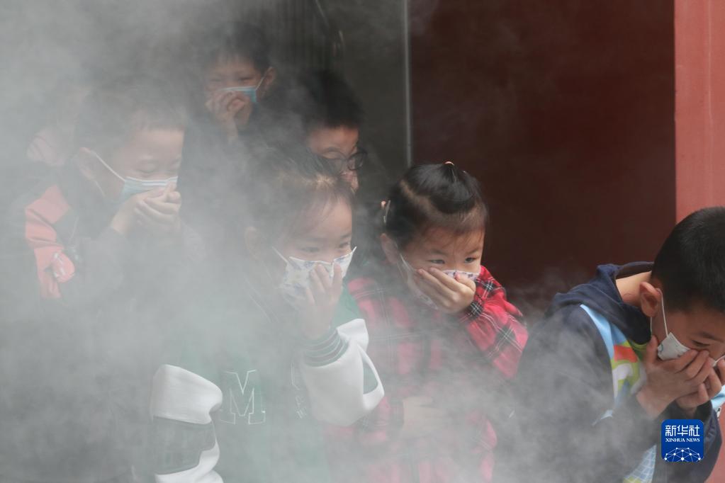 11月9日,在江蘇省無錫市揚名中心小學,學生在消防應急疏散演練中撤離教學樓。