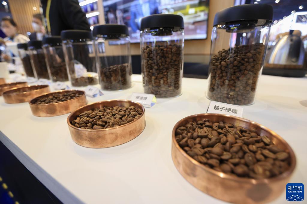 11月9日在第五屆進博會食品及農產品展區麥隆咖啡展臺拍攝的咖啡豆。