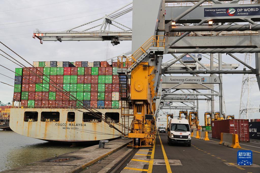 10月27日,在比利時安特衛普,船舶??吭诒壤麜r安特衛普-布魯日港的集裝箱碼頭。新華社記者 鄭煥松 攝
