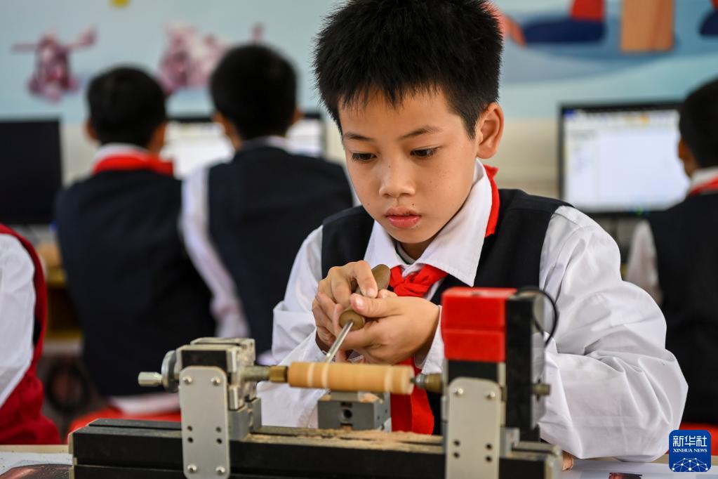 11月9日,在廣西興業縣石南鎮至德小學,一名學生用機器制作木雕。