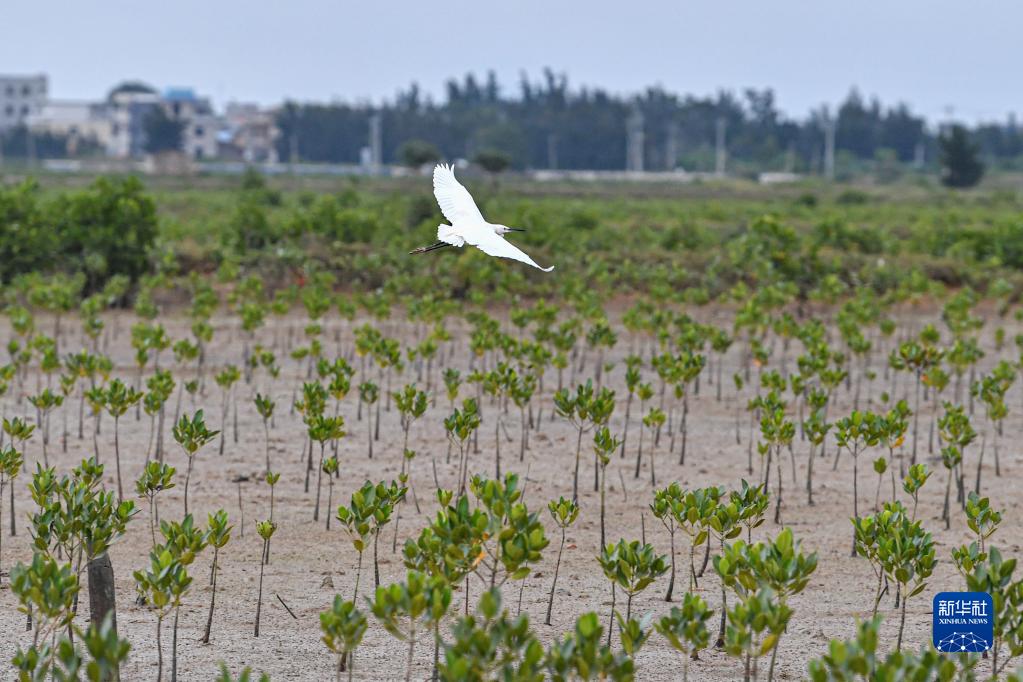 11月8日,鷺鳥在海南省儋州市新英鹽場濕地上空飛翔。新華社記者 蒲曉旭 攝