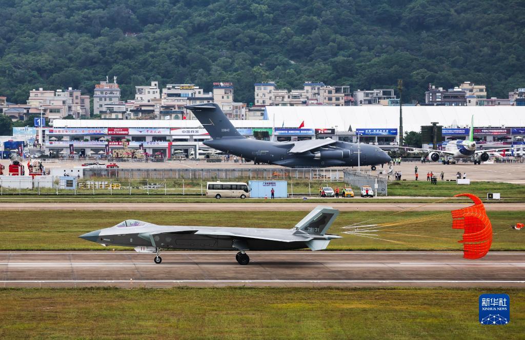 在第十四屆中國航展上,殲-20(前)降落珠海機場后從運油-20前滑過(11月8日攝)。新華社記者 劉大偉 攝