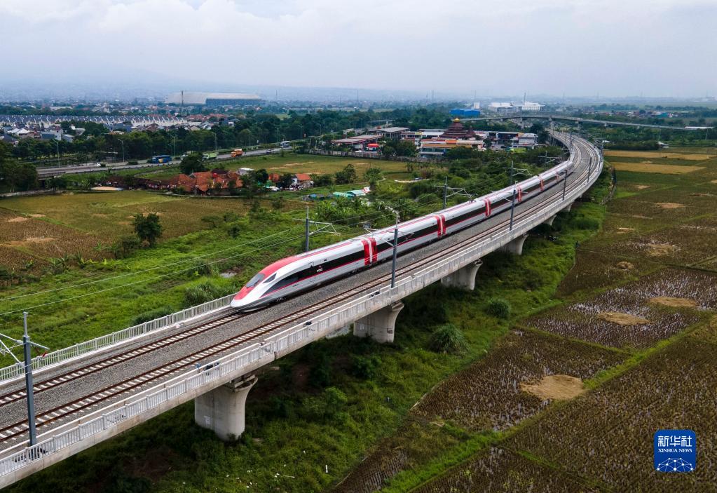 11月9日,在印度尼西亞西爪哇省萬隆市,一列高鐵動車組正在雅萬高鐵試驗段進行熱滑試驗(無人機照片)。