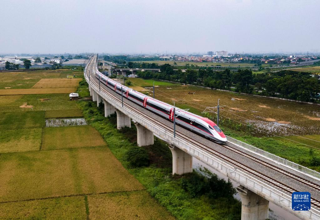 11月9日,在印度尼西亞西爪哇省萬隆市,一列高鐵動車組正在雅萬高鐵試驗段進行熱滑試驗(無人機照片)。