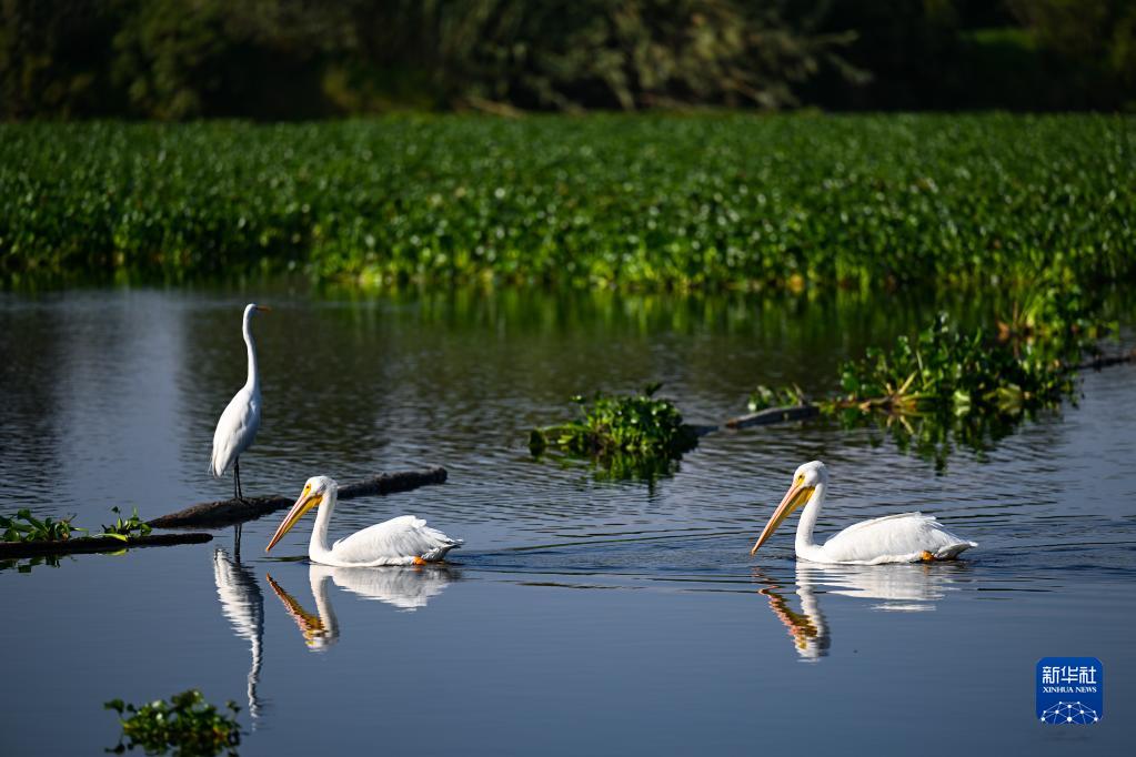 這是在墨西哥首都墨西哥城霍奇米爾科生態公園拍攝的鵜鶘和白鷺(2022年11月2日攝)。