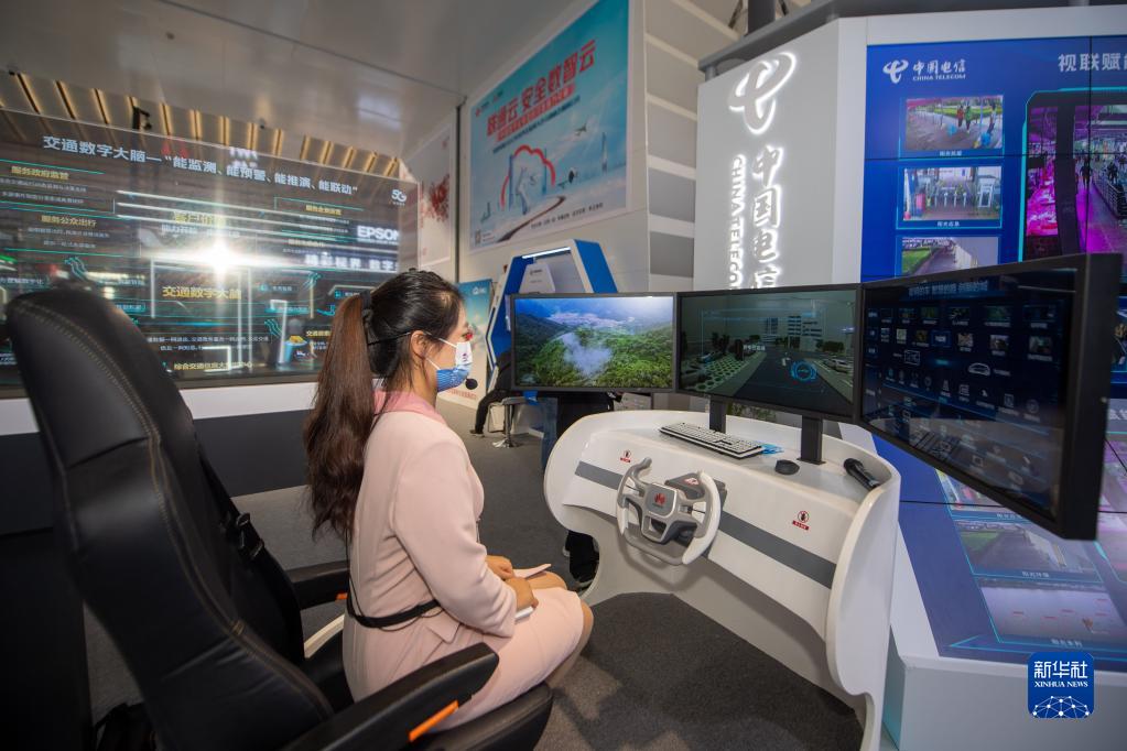 11月10日,中國電信展臺工作人員演示無人駕駛系統的運行。