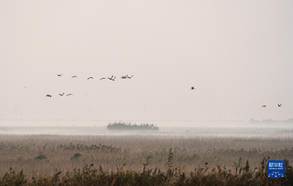 成群的禽鳥飛翔在鹽城濕地珍禽國家級自然保護區(11月8日攝)。