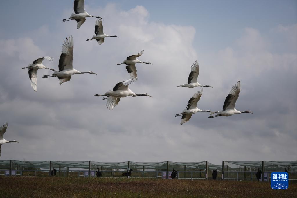 在鹽城濕地珍禽國家級自然保護區,人工繁殖的丹頂鶴在飛翔(11月8日攝)。