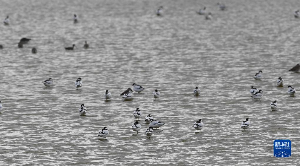 反嘴鷸在鹽城濕地珍禽國家級自然保護區水面停歇(11月8日攝)。