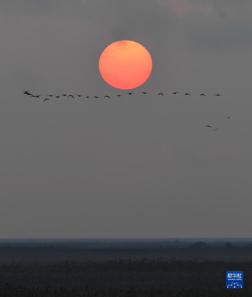 鹽城濕地珍禽國家級自然保護區日出景色(11月8日攝)。