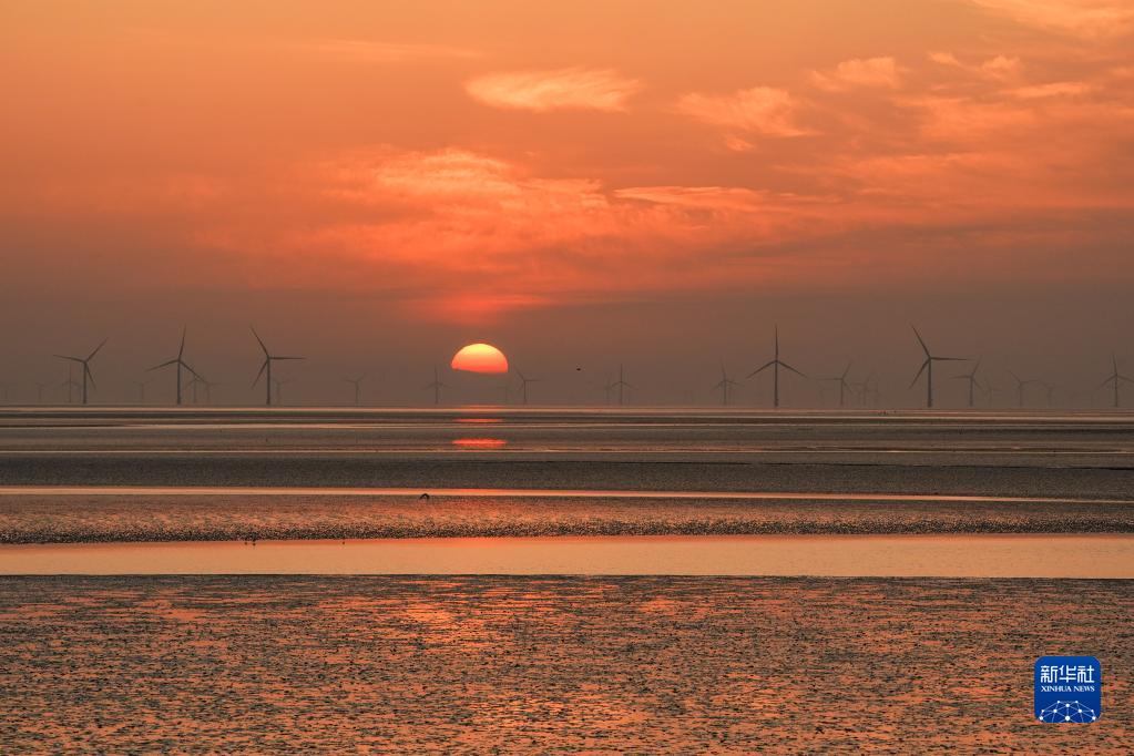 鹽城東臺條子泥濕地日出景象(11月9日攝,無人機照片 )。