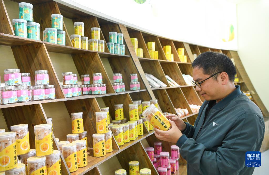 11月9日,在重慶市梁平區合興鎮龍灘村一家柚子營銷中心,消費者在選購柚子果干產品。