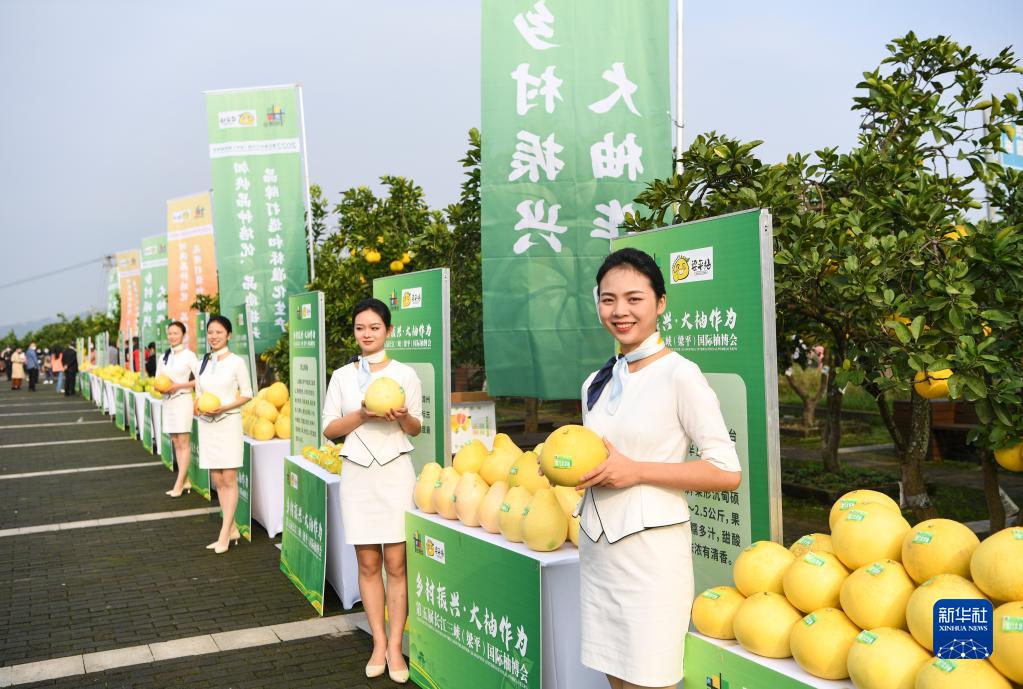 11月9日,在重慶市梁平區合興鎮龍灘村,工作人員在柚博會上展示柚子。
