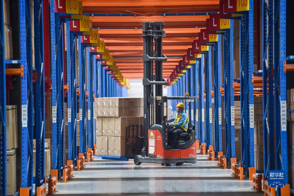 11月10日,在位于江蘇省南京市江寧區的蘇寧華東物流中心,工人駕駛叉車搬運商品。