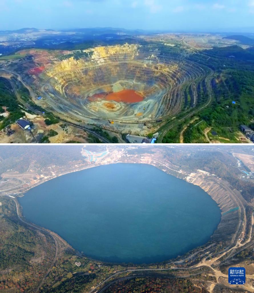 拼版照片:上圖為開采中的向山鎮凹山采場(資料照片),下圖為生態修復后的凹山采場(新華社記者劉軍喜11月8日攝,無人機照片)。