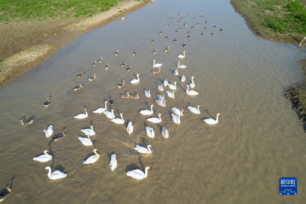這是11月10日在湖南西洞庭湖濕地拍攝的小天鵝和灰雁(無人機照片)。