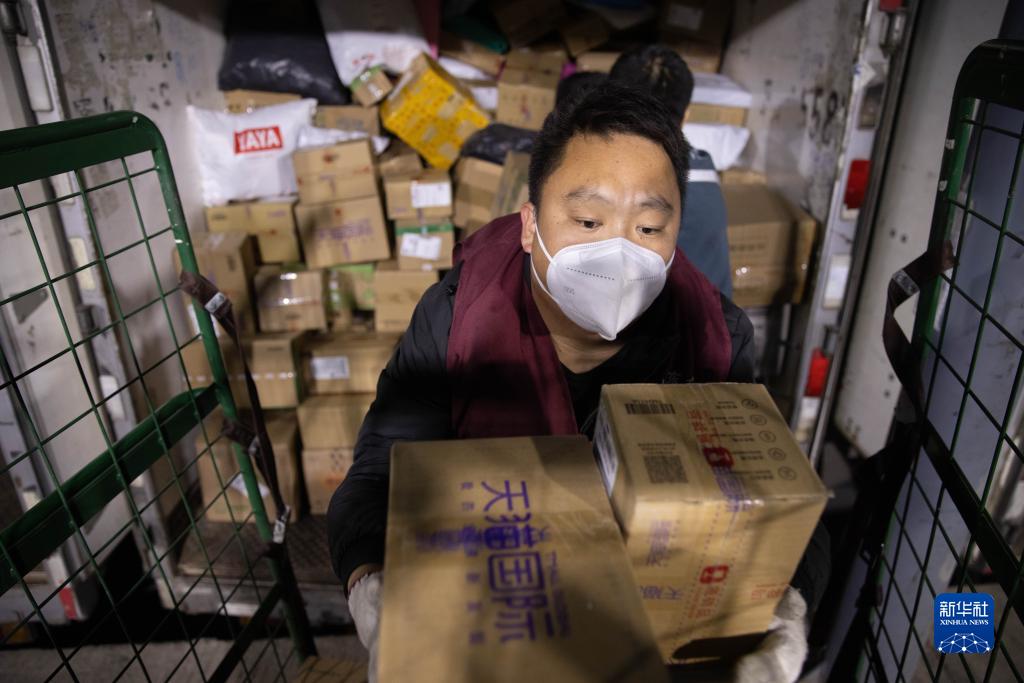 11月10日,工作人員在中國郵政哈爾濱郵區中心局郵件處理中心搬運快遞。