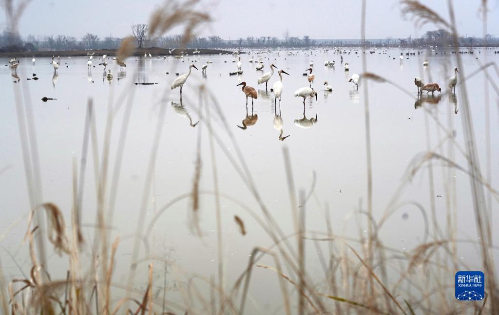 在南昌市高新區五星白鶴保護小區,白鶴、天鵝等候鳥在濕地中棲息覓食(1月12日攝)。