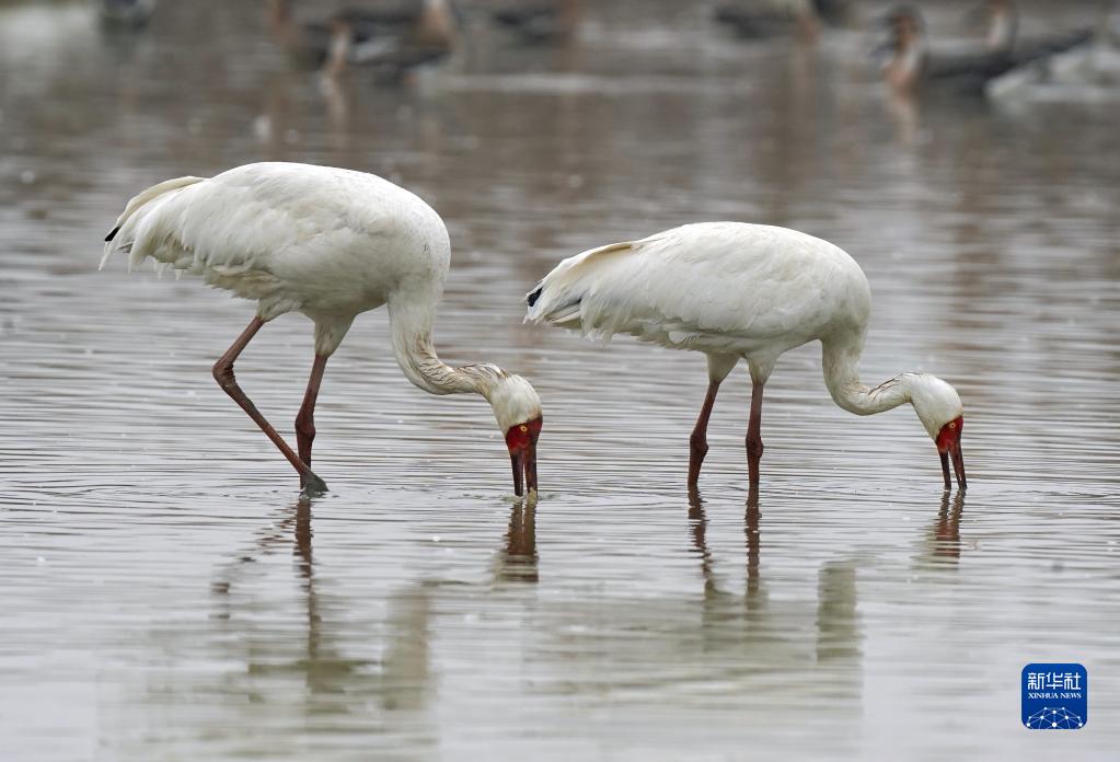 在南昌市高新區五星白鶴保護小區,白鶴在濕地里覓食(1月12日攝)。