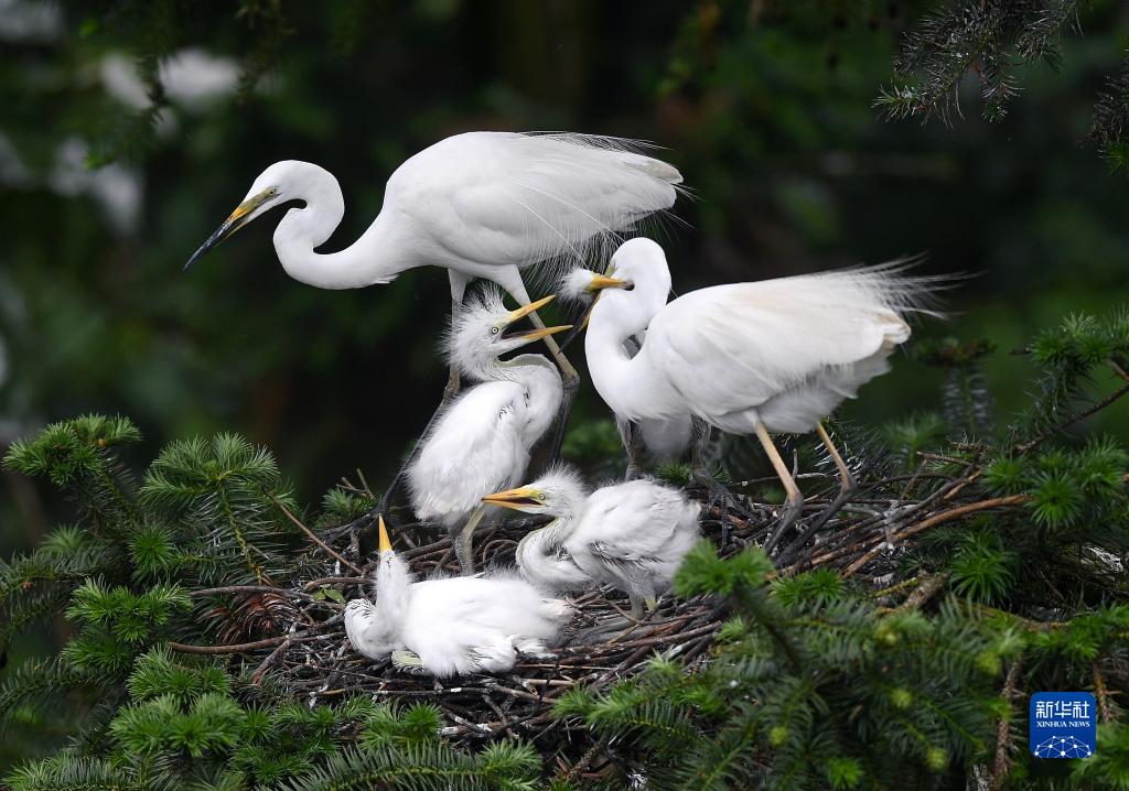 在南昌市新建區象山森林公園,白鷺在給雛鳥喂食(2021年5月18日攝)。