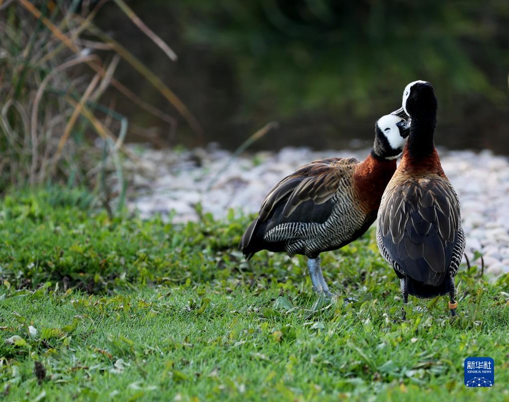 兩只白臉樹鴨在英國倫敦濕地中心相互整理羽毛(11月9日攝)。