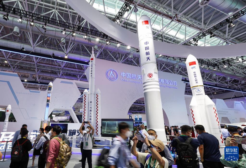 中國新一代運載火箭家族模型——捷龍三號運載火箭、長征六號改運載火箭、新一代載人運載火箭、重型運載火箭、長征五號B運載火箭亮相中國航展(11月9日攝)。