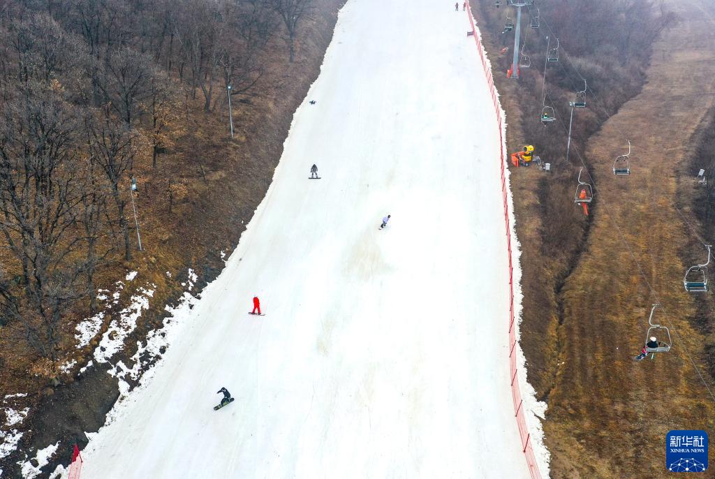 11月11日,滑雪愛好者在長春市廟香山滑雪場滑雪(無人機照片)。