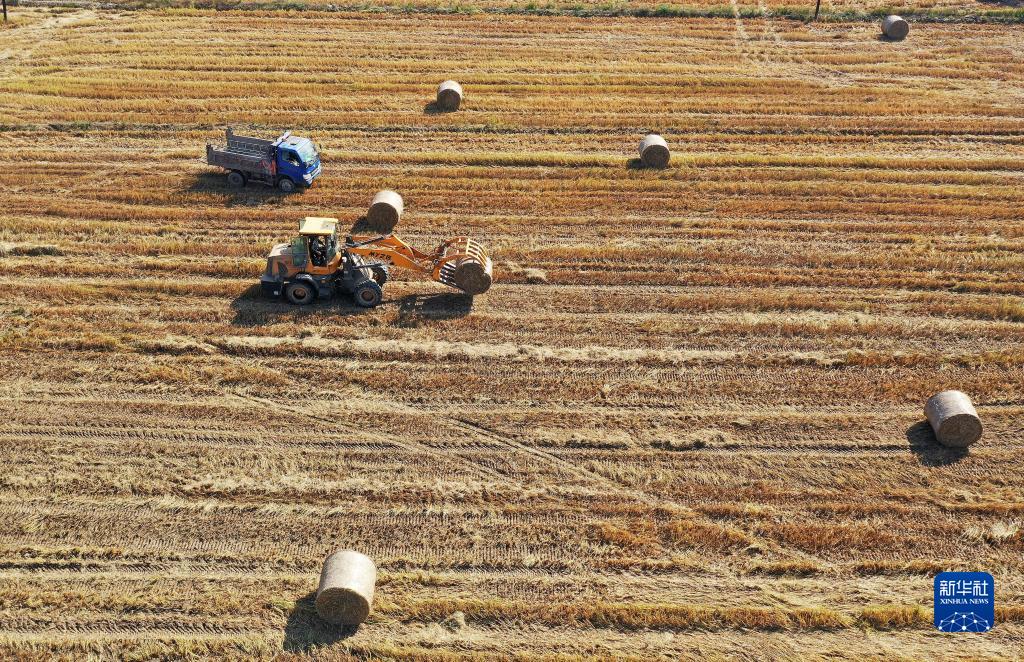 在南昌縣廣福鎮,農民在回收稻田里的秸稈(11月10日攝,無人機照片)。