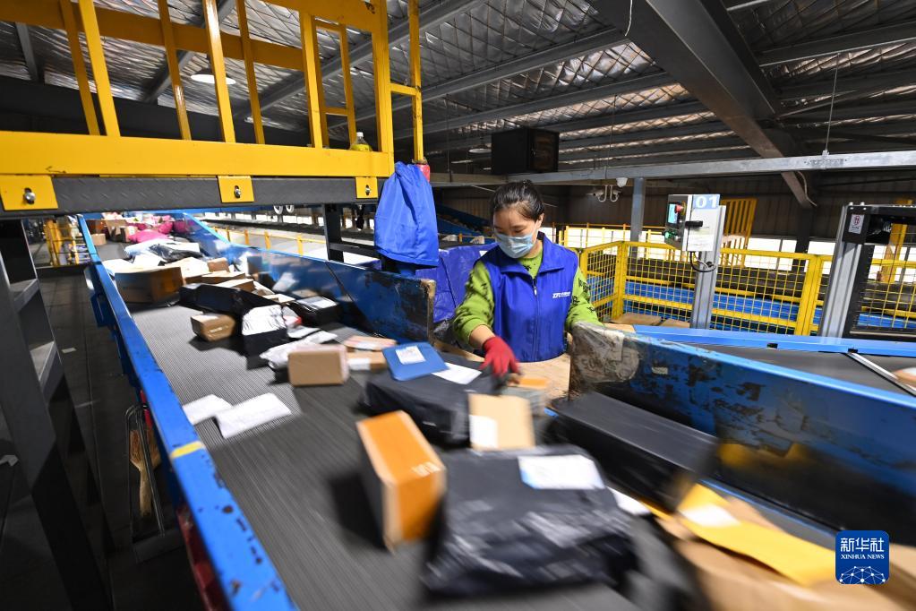 11月11日,在山西太原一家快遞企業的轉運中心,工作人員在分揀包裹。