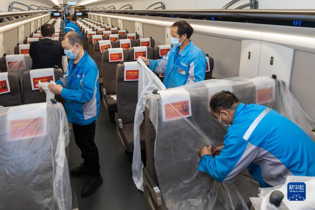 11月11日,在上海虹橋站,工作人員為列車座椅套上保護套。為應對 “雙11”物流高峰,中國鐵路上海局集團公司將部分載客高鐵動車組列車用于快件運輸。