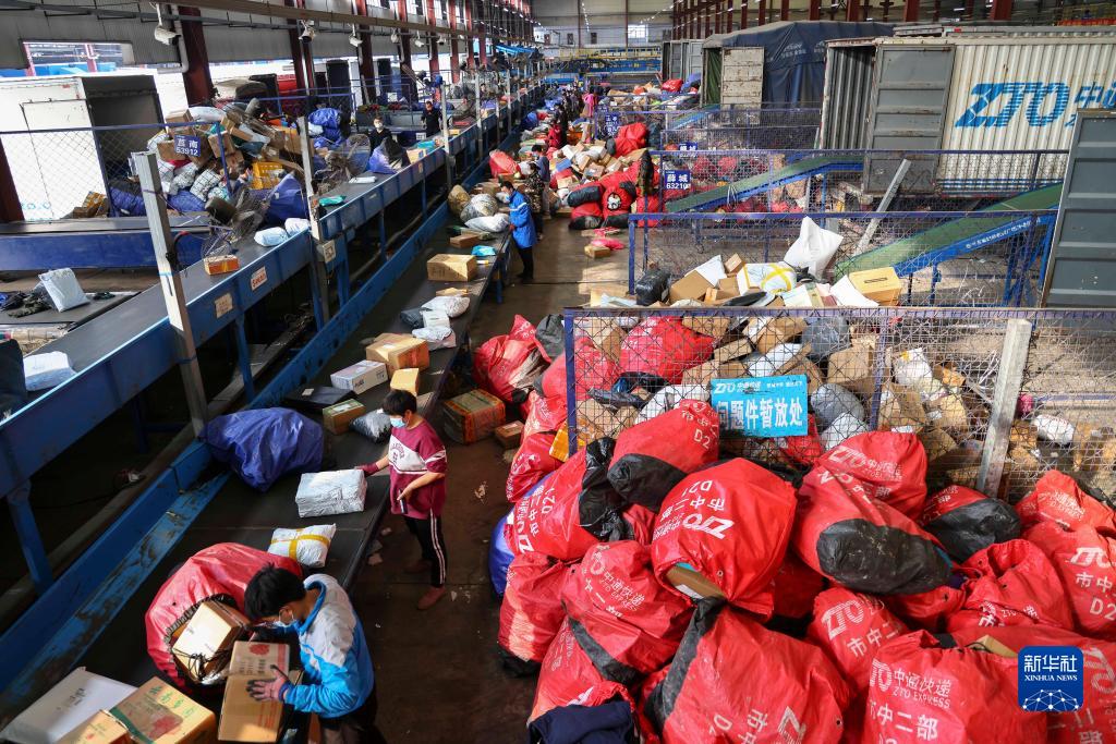 11月11日,在山東省臨沂市蘭山經濟開發區國際陸港智慧物流園內,工作人員在分揀快遞。