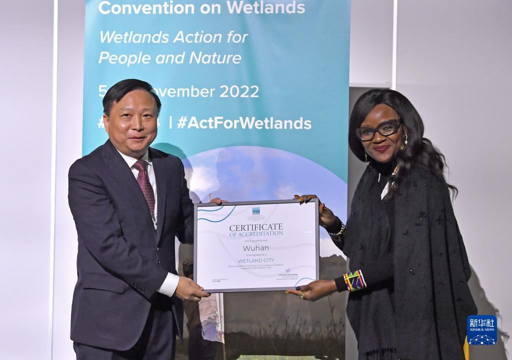 11月10日,在瑞士日內瓦,《濕地公約》秘書長蒙巴(右)為中國湖北武漢頒發“國際濕地城市”認證證書。