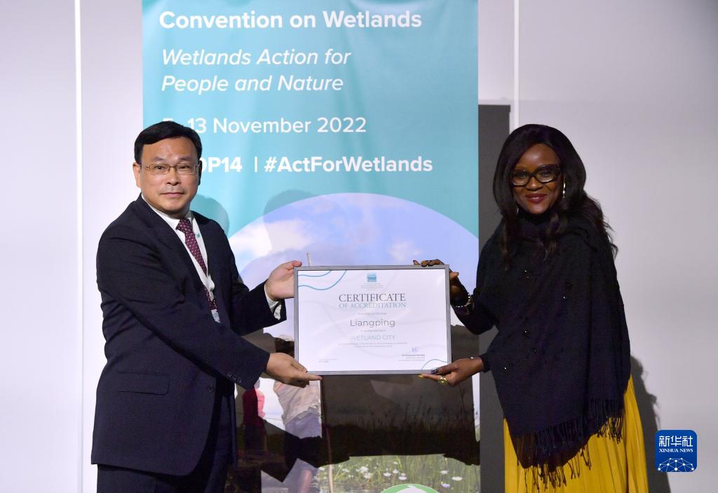 11月10日,在瑞士日內瓦,《濕地公約》秘書長蒙巴(右)為中國重慶梁平頒發“國際濕地城市”認證證書。