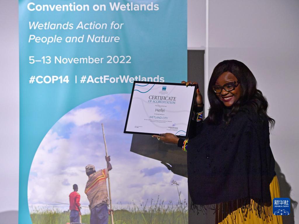 11月10日,在瑞士日內瓦,《濕地公約》秘書長蒙巴手舉為中國安徽合肥頒發的“國際濕地城市”認證證書。