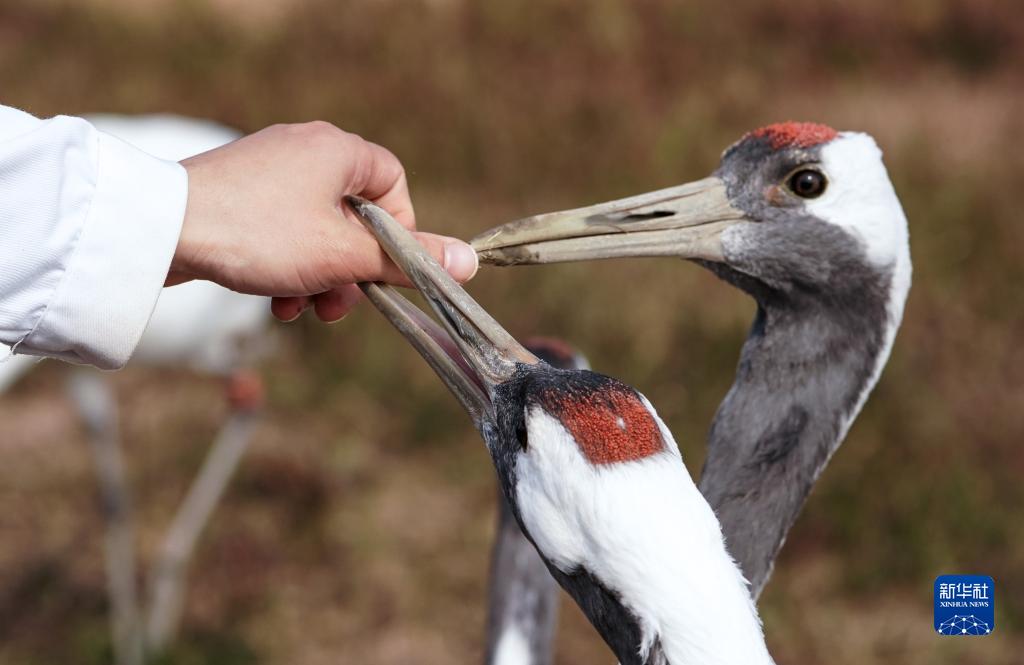 保護區馴養員與人工繁育的丹頂鶴互動(11月8日攝)。