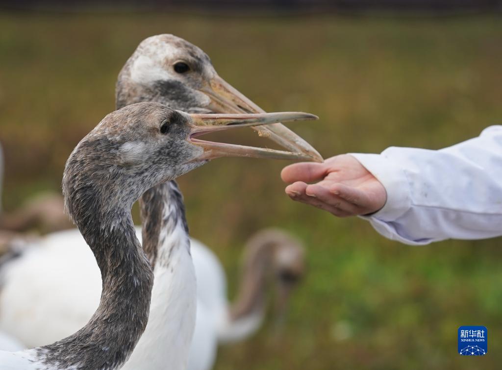 保護區馴養員與人工繁育的丹頂鶴互動(11月8日攝)。