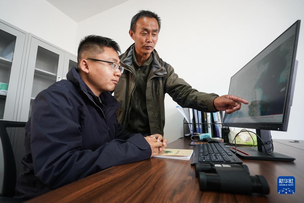 保護區科研人員陳衛華(右)和李洪磊通過衛星追蹤器監測救護后放飛自然的東方白鸛活動以及遷移路線(11月7日攝)。