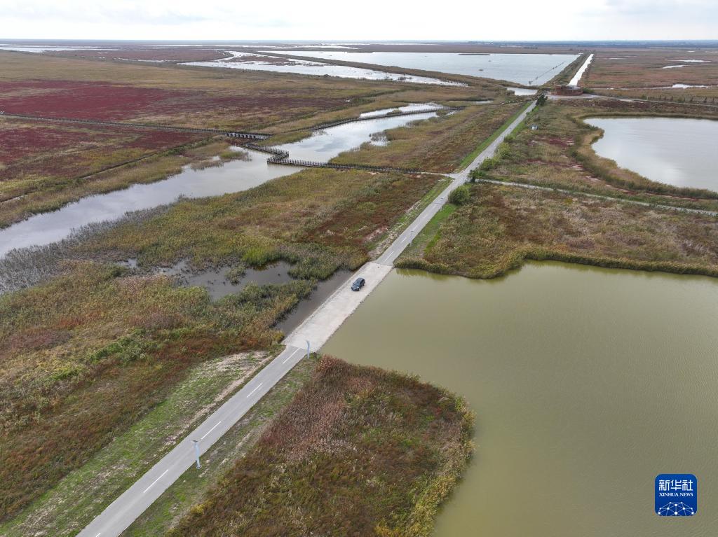 保護區科研人員李征浩和趙永強驅車前往目的地,開展鳥類多樣性調查和監測(11月8日攝,無人機照片)。
